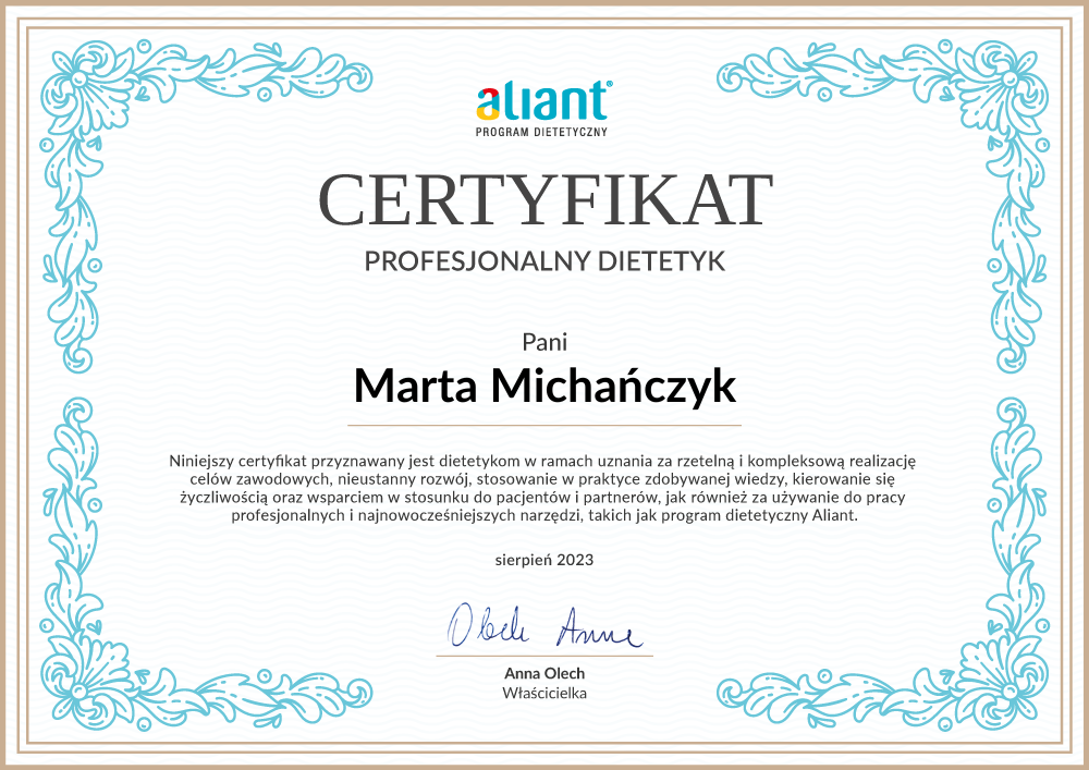 W domu powtarzamy, że jak się nie chce, to gorzej niż by się nie umiało. Skoro czytasz moje bio, to pragnę zapewnić, że podzielę się z Tobą zarówno moimi chęciami jak i wiedzą, pomogę zrealizować Twój żywieniowy cel, a ta współpraca będzie w 100% dostosowana do indywidualnych potrzeb. Żadnych kompromisów, żadnych szablonów jadłospisów i dietetycznego „kopiuj – wklej”. Wsłuchuję się w to, z czym do mnie przychodzisz. Często problem zdrowotny zależny od diety jest jedynie wierzchołkiem góry lodowej. Tu wchodzimy w komponenty stylu życia, w tym aktywność fizyczną, zdolność relaksacji i radzenia sobie ze stresem, higienę snu, relację z jedzeniem i psychodietetykę.