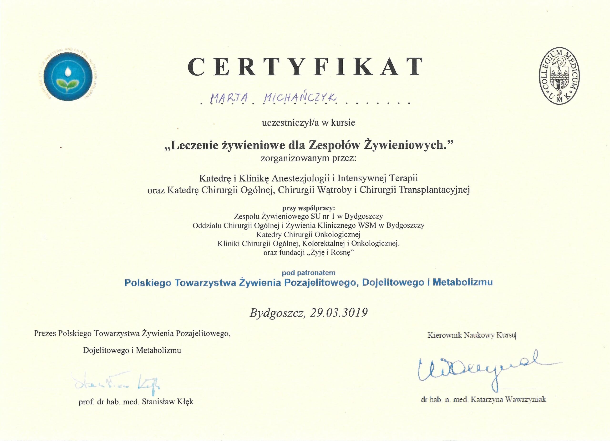 Studia licencjackie ukończyłam na Collegium Medicum w Bydgoszczy ze specjalizacją dietoterapia. Pasjonowałam się wówczas i byłam zawodowo związana z żywieniem w onkologii. Praktykowałam już również jako dietetyk. Następnie był II etap czyli studia magisterskie w Bydgoskiej Szkole Wyższej i własny gabinet w moim rodzinnym mieście – Bydgoszczy.